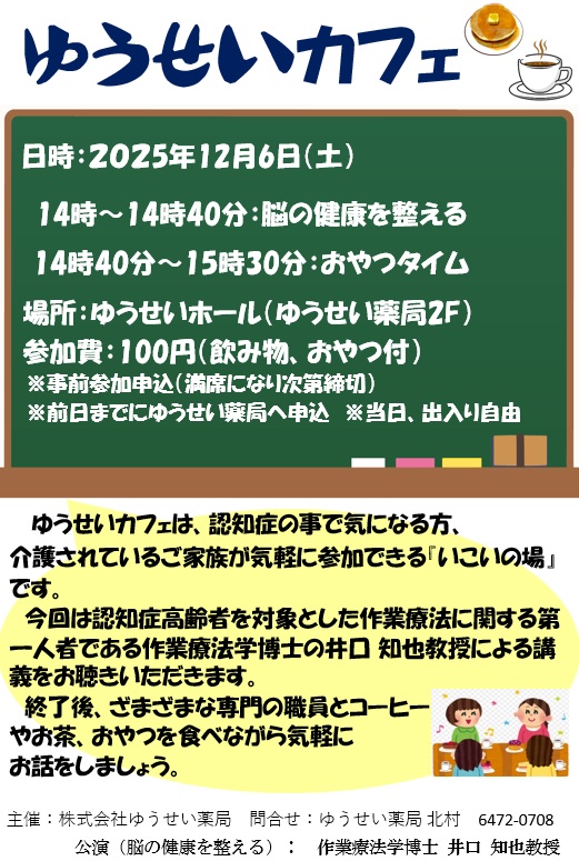 来たる12月6日(土)ゆうせいカフェが開催されます。おかげさまで今回は満席となりました。