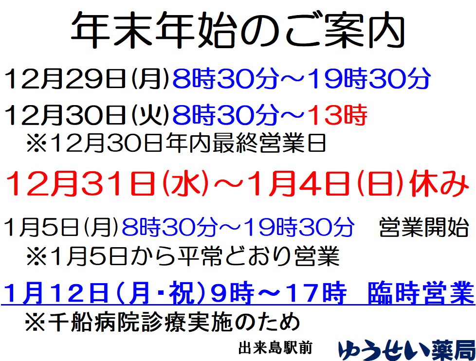 年末年始のご案内です。年末は12月30日(火)13時まで営業